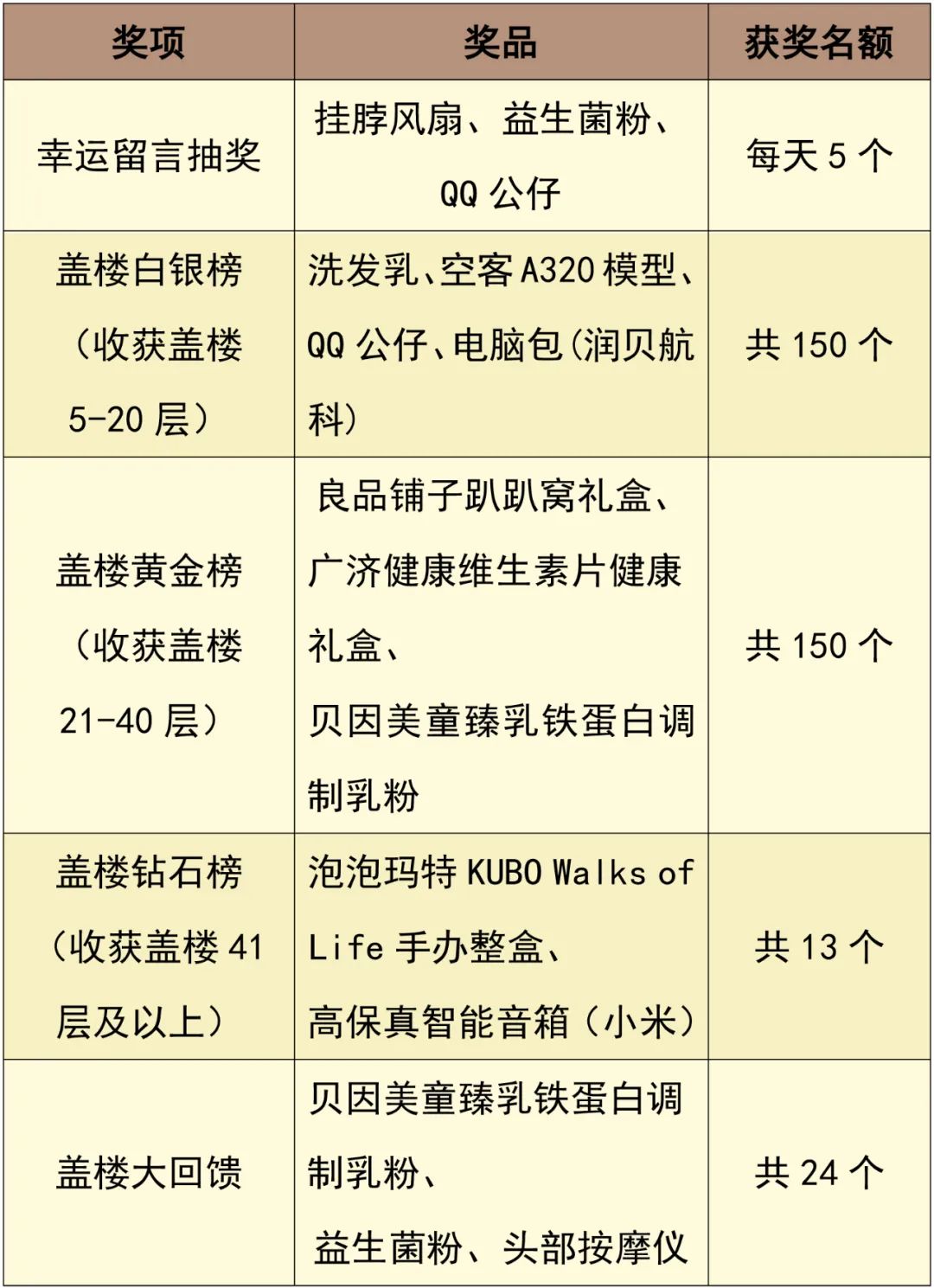 盖楼争霸奖:活动期间,先留一条言成为“楼主”,然后邀请朋友在这条留言下盖楼,也就是回复自己的留言。活动结束后,按照这条留言盖楼的层数(即回复留言的条数。同一用户如果多次回复留言,只算一次、一层楼),“楼主”可获得相应档次的奖品,分为白银奖、黄金奖、钻石奖。因名额限制未能获奖的“楼主”,还有机会获得“盖楼大回馈”的抽奖。